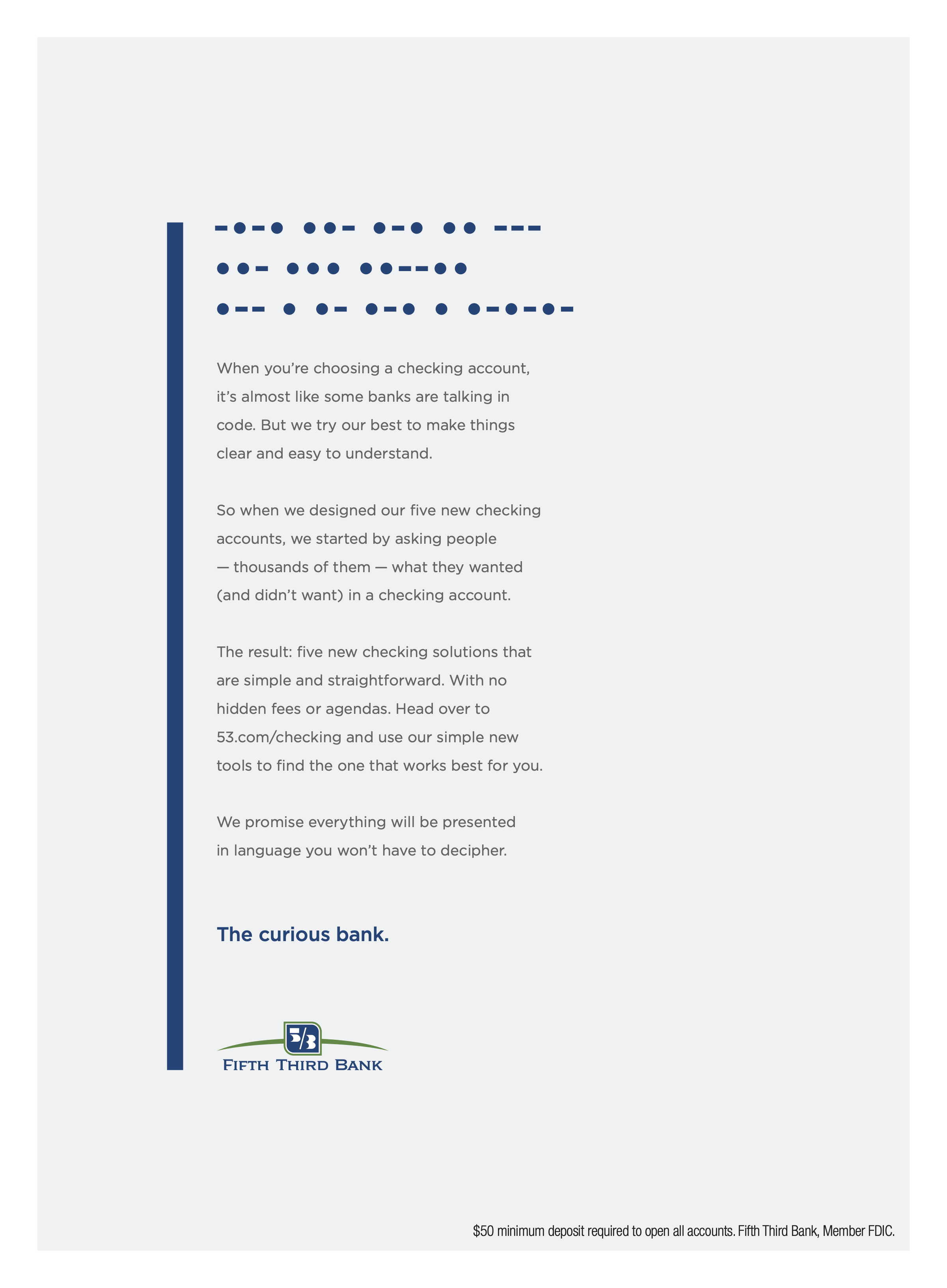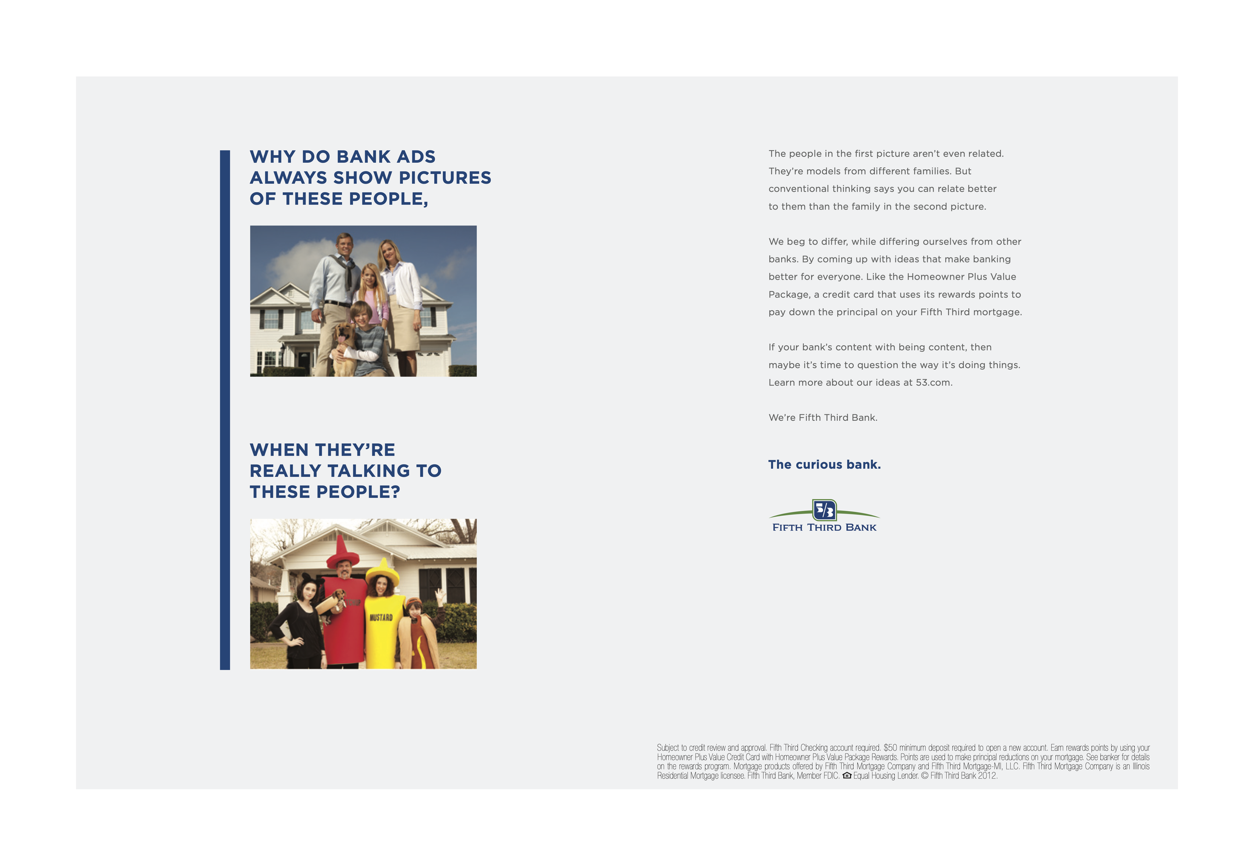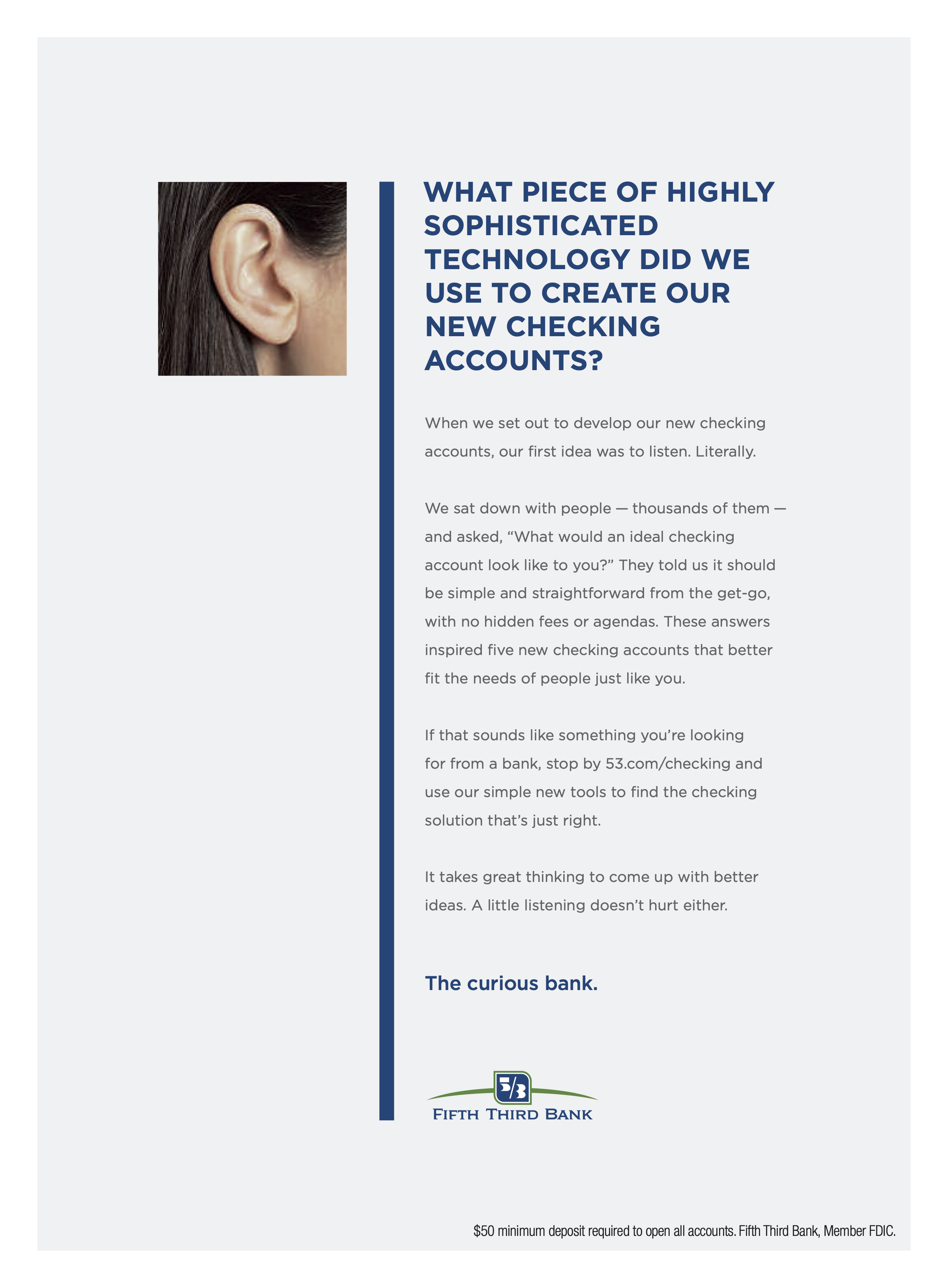 When Fifth Third Bank came to us, they needed help with their rebrand. After digging into their company, what we uncovered was their unique approach to banking: asking questions to get to better answers for their customers. Fast forward through the entire creative process, and The Curious Bank is born. It allowed for some fun, attention-grabbing workâsome humorous, some not-so-much. Whatever the tone, everything always came back to curiosity. The ads below were a small chunk of the initial brand push that spanned several teams.