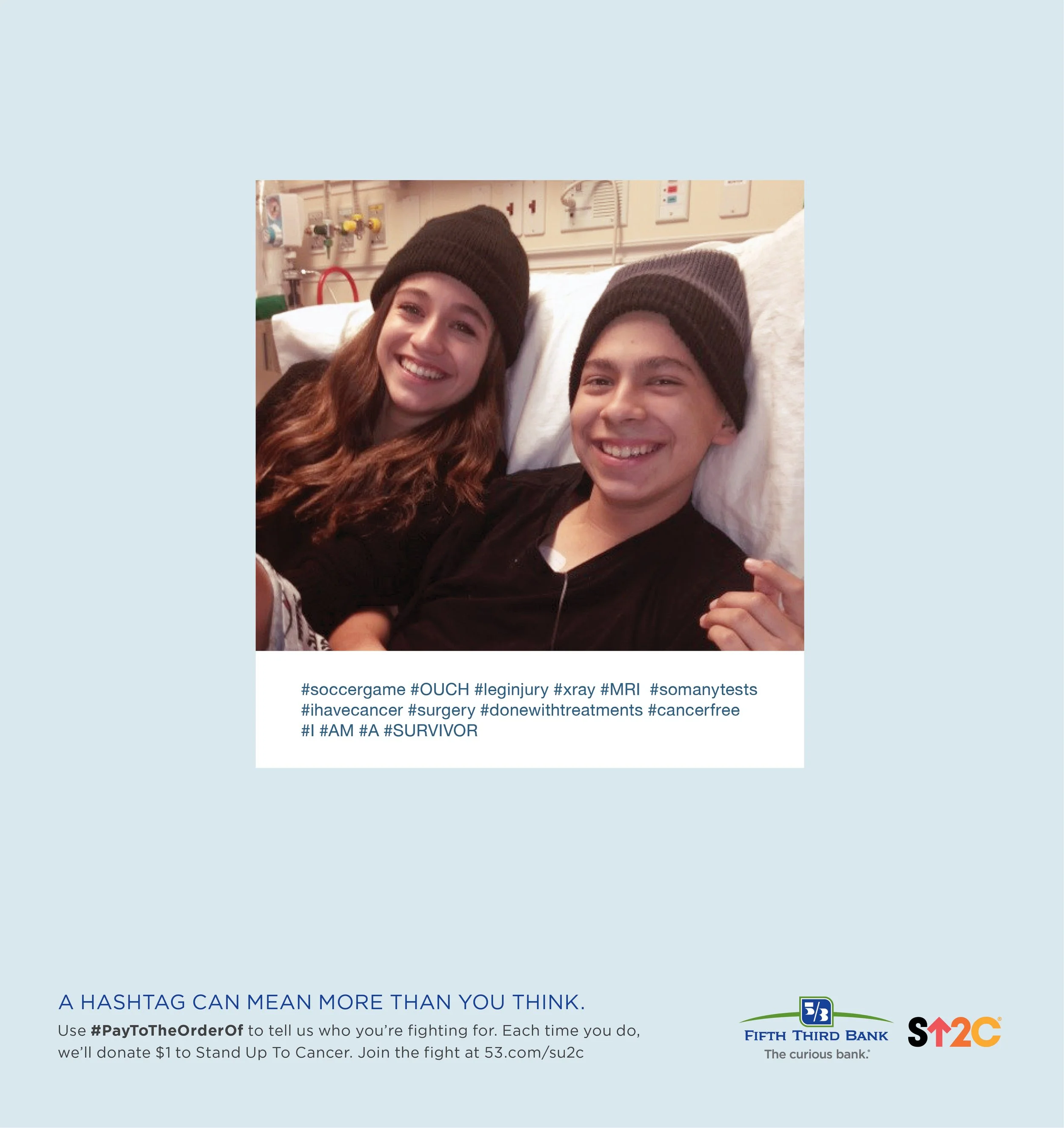 Print & SocialIn addition to the checking account promotion, Fifth Third Bank donated $1 each time someone used #PayToTheOrderOf on social. These were a few print ads we ran, where the hashtags told each patient’s story.