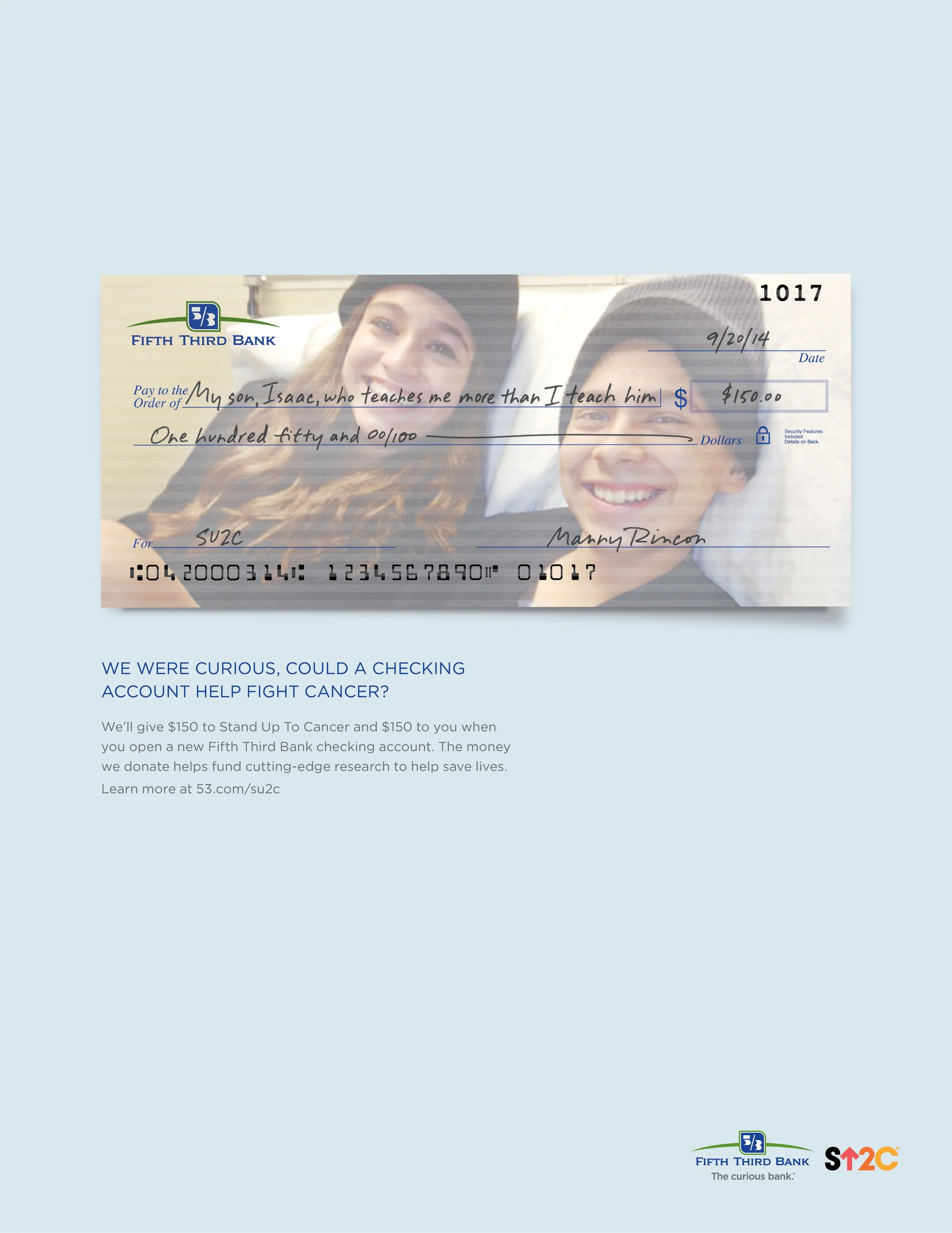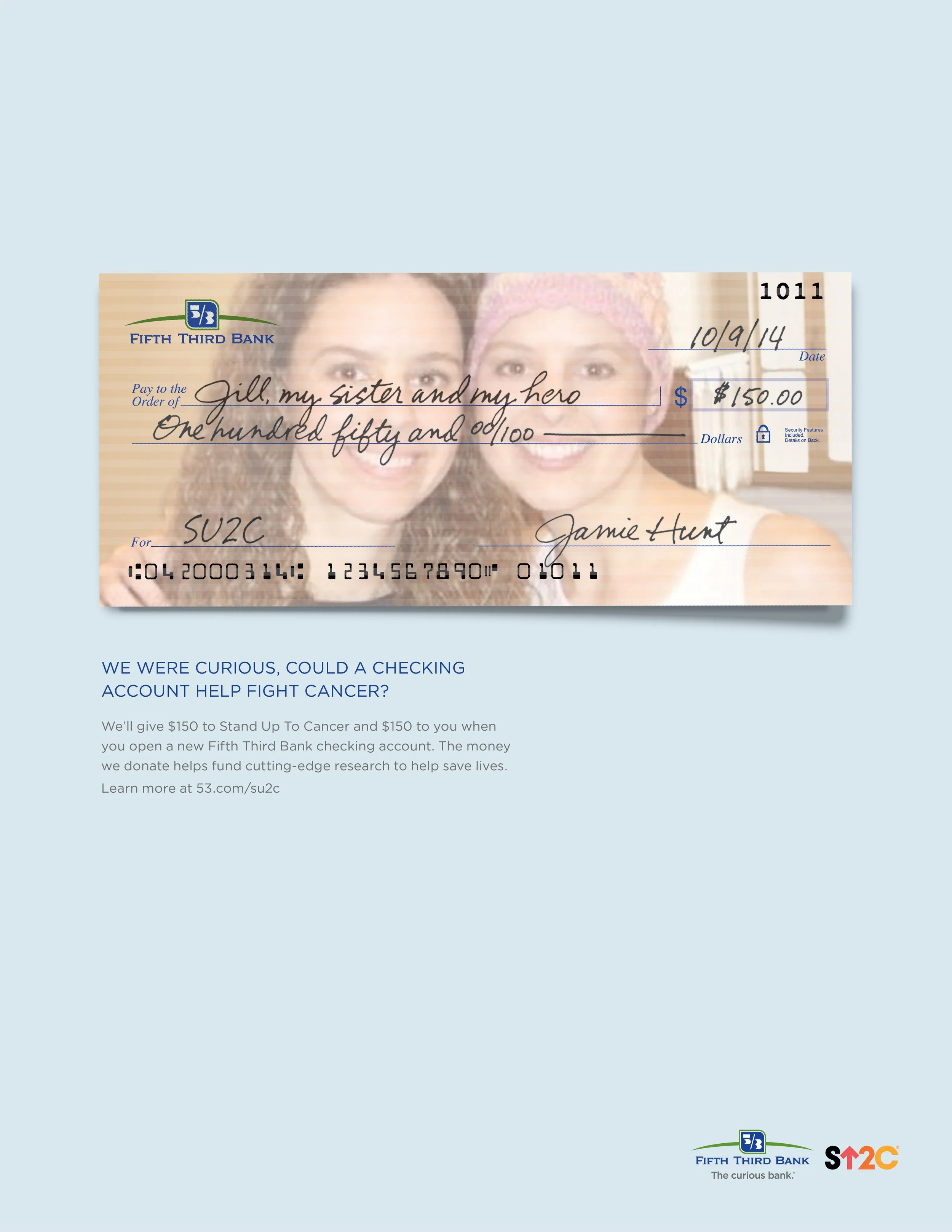 We'll give $150 to Stand Up To Cancer and $150 to you when you open a new Fifth Third Bank checking account. The money we donate helps fund cutting-edge research to help save lives. Learn more at 53.com/su2c