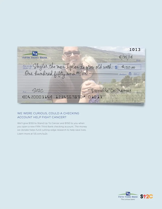 Fifth Third Bank, "Pay to the Order of"What if a checking account could help fight cancer? That was the premise of this campaign where Fifth Third Bank (branded as “The Curious Bank” at the time) would donate $150 to Stand Up 2 Cancer and give the customer $150.