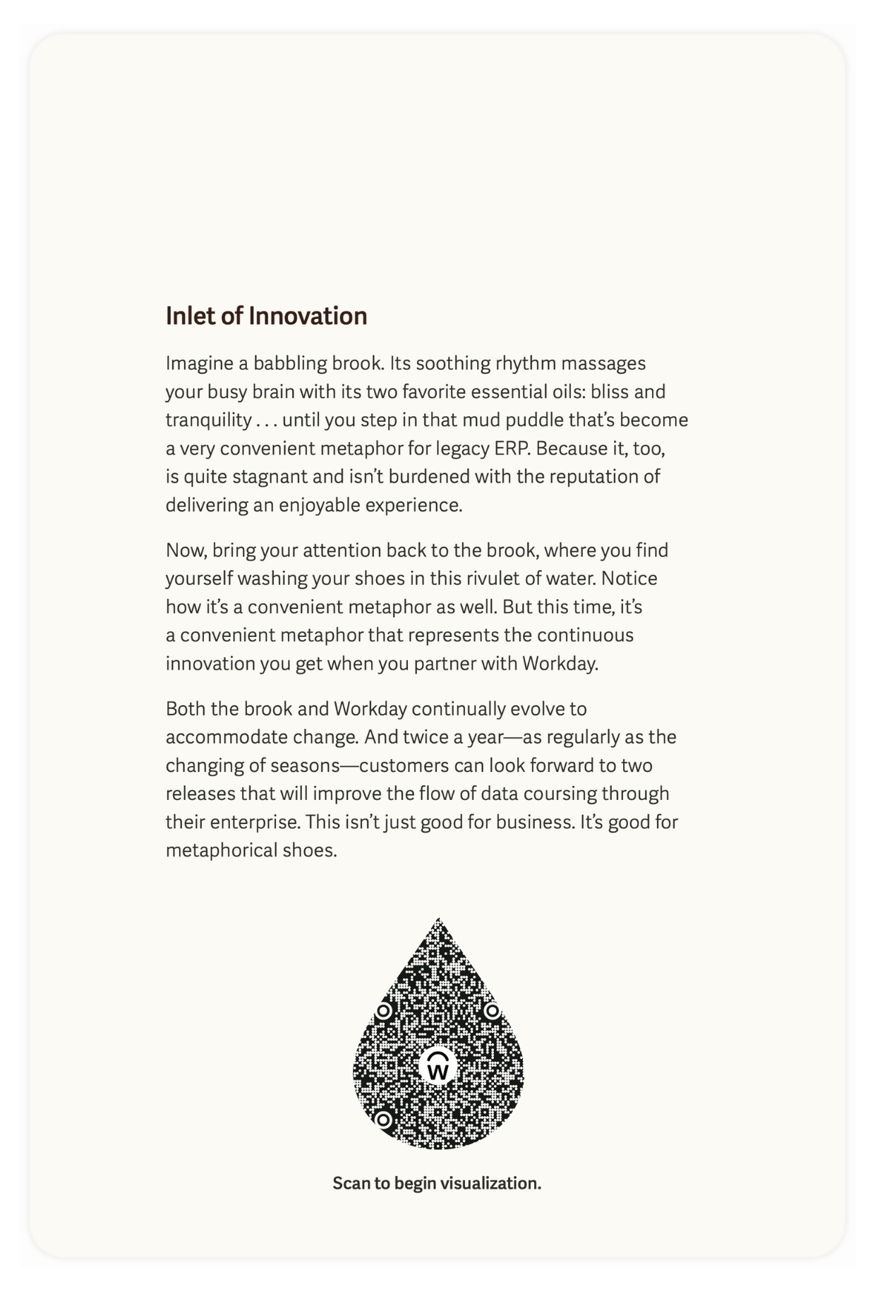 To get their attention and assuage fears, we created guided visualizations on Spotify that helped them imagine their lives with Workday. This calming and reassuring experience started when a CFO received their Tranquil Transformations Kit in the mail.